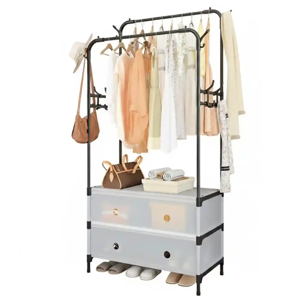 Zapatero Perchero Doble de Lujo 63 cm Descripción del Producto Unidad de almacenamiento multifuncional diseñada para optimizar espacios pequeños, combinando un perchero doble con un organizador de cajones. Su estructura moderna y minimalista en color negro permite mantener la ropa, accesorios y calzado perfectamente ordenados, convirtiéndolo en una solución ideal para dormitorios, recibidores o vestidores. Especificaciones Estructura y Diseño Estructura de doble riel: Dos barras horizontales a diferentes alturas que permiten colgar camisas, vestidos, chaquetas y abrigos de forma organizada. Almacenamiento inferior: Módulo con dos cajones grandes traslúcidos, ideales para ropa doblada, ropa interior o accesorios, manteniendo el orden visual. Ganchos laterales: Ganchos tipo “árbol” en los costados para colgar bolsos, bufandas, sombreros o paraguas. Espacio para calzado: Base elevada que permite ubicar zapatos o sandalias de uso diario. Material: Estructura metálica resistente con acabado en color negro. Estilo: Minimalista y moderno, adaptable a cualquier ambiente. Beneficios del Producto Aprovecha al máximo espacios reducidos. Permite organizar ropa larga y corta sin que se amontone. Mantiene accesorios y calzado siempre visibles y accesibles. Cajones amplios que protegen y ordenan prendas delicadas. Aporta orden, elegancia y funcionalidad al ambiente. Dimensiones Altura total: 175 cm Ancho (base): 63 cm Profundidad: 28 cm Altura del módulo de cajones: 47 cm Altura riel frontal: 119 cm (desde el suelo) Altura riel trasero: 128 cm (desde el módulo de cajones hasta el tope) Contenido del Paquete 1 Zapatero perchero doble de lujo Módulo de 2 cajones traslúcidos Kit de instalación Manual de armado Garantía Este producto cuenta con 30 días de garantía por defectos de fabricación. Política de Retracto Aplica derecho de retracto dentro de los 5 días hábiles posteriores a la entrega. El producto debe devolverse sin uso, en perfecto estado y con su empaque original intacto. Nota Importante Para aplicar garantía o retracto se deben enviar fotos y/o videos que evidencien claramente el estado del producto. La garantía no cubre daños por golpes, humedad, mal uso o manipulación indebida.