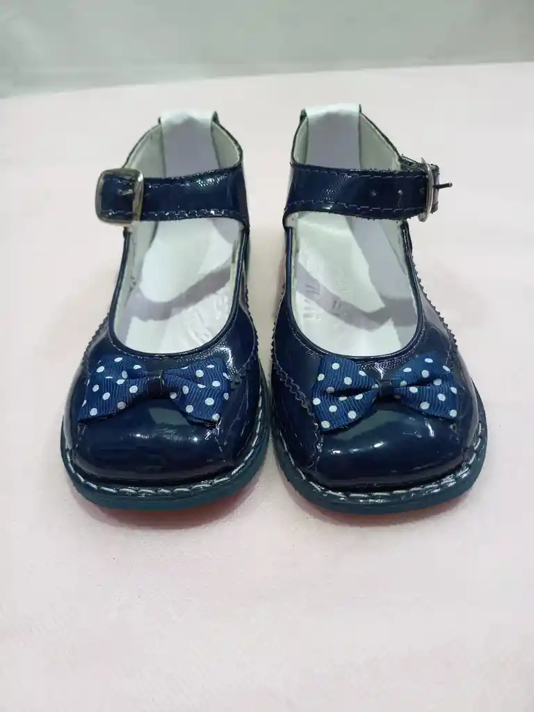 Zapato no tuerce para niña, en charol, con moño de accesorio, color azul, número 22
