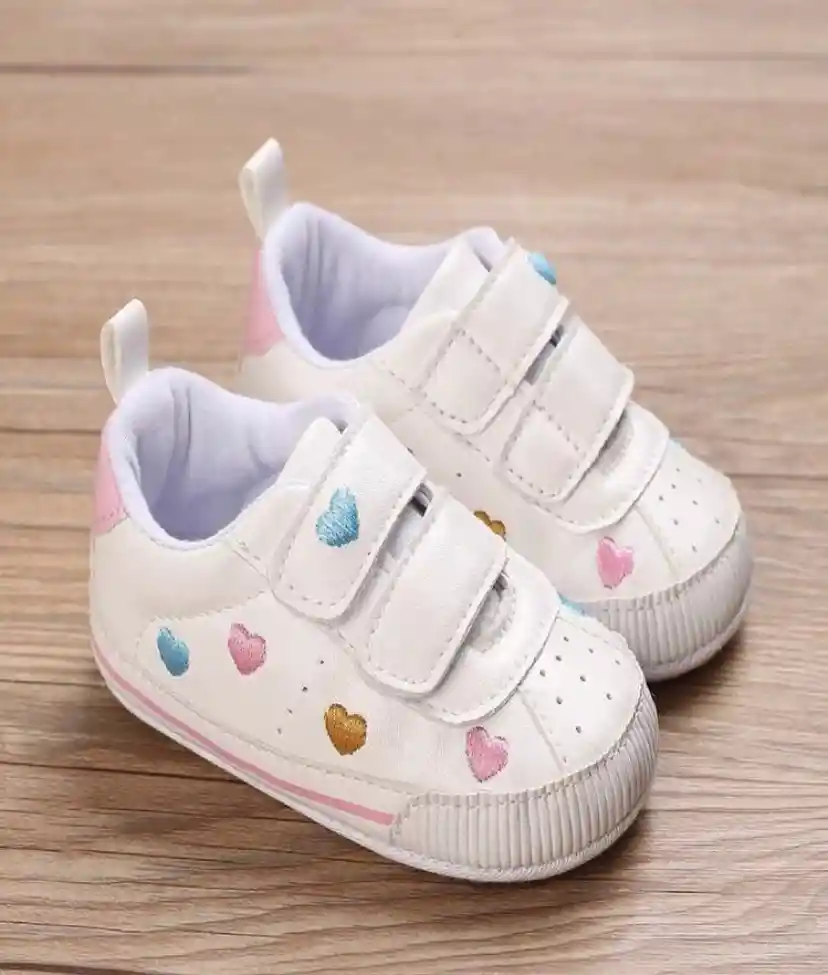 Estos adorables zapatos para bebé niña combinan estilo y comodidad. Su diseño blanco con corazones bordados en tonos pastel los hace perfectos para cualquier ocasión: desde un paseo hasta una sesión de fotos. ✅ Material suave y transpirable. ✅ Suela antideslizante para mayor seguridad en los primeros pasos. ✅ Cierre con velcro para poner y quitar fácilmente. ✅ Livianos y flexibles, ideales para bebés de 6 a 18 meses. Colores: Blanco con detalles rosados, dorados y azules. talla 19 aproximadamente 11 cm