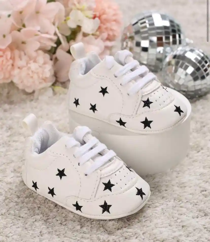 Estos zapatos para bebé unisex combinan diseño moderno y comodidad. Hechos en material suave, con estrellas negras bordadas que le dan un toque tierno y elegante. Perfectos para bebés que comienzan a gatear o dar sus primeros pasos Talla 19 aprox 12.5 cm ✅ Material flexible y cómodo. ✅ Suela antideslizante para mayor seguridad. ✅ Fáciles de poner gracias a su cierre con cordones elásticos