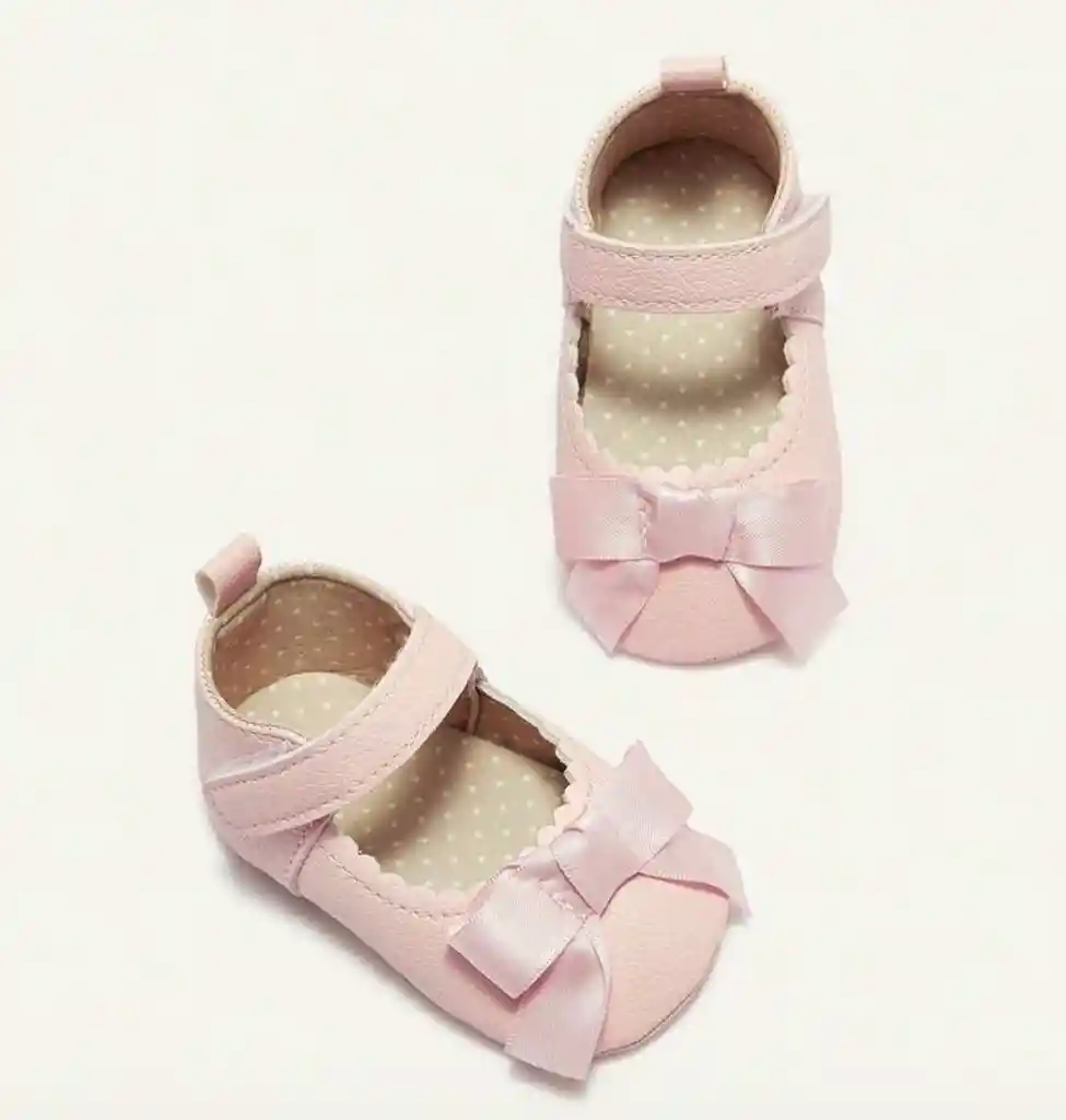 Talla 19 12.9 cm Dale un toque de dulzura a los pies de tu bebé con estas hermosas baletas en tono rosa pastel. Destacan por su acabado de textura suave, bordes ondeados y un elegante moño de satén que las hace únicas. El interior acolchado con motivo de lunares asegura comodidad durante todo el día. Perfectas para baby showers, sesiones de fotos o salidas especiales. • Ajuste: Correa con velcro para mayor facilidad.
