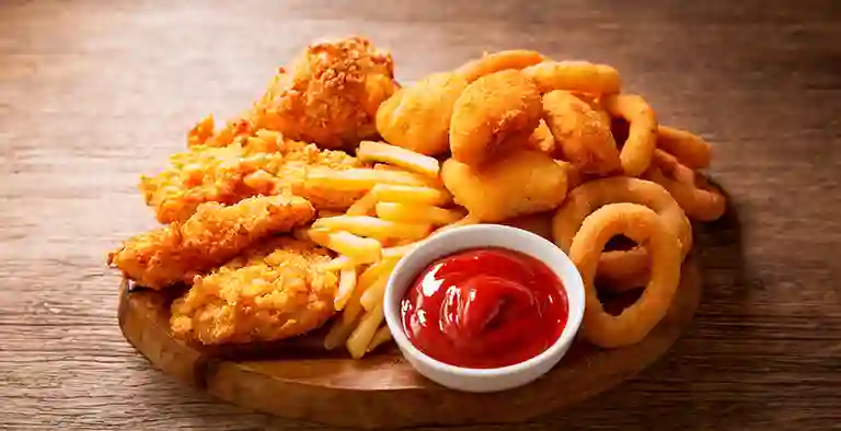 Bastones de pechuga de pollo apanados en panko, acompañados de 80 g de papas fritas y salsa a elección.