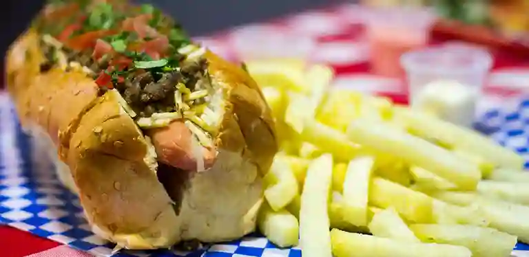 Salchicha, queso, papitas crocantes, carne molida, ají, pico de gallo y salsas.