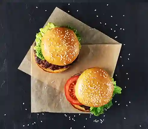 Hamburguesa de res 110gr 2 porciones con doble queso, tomate, cebolla roja, lechuga crespa, salsa al gusto (selecciona dos salsas).