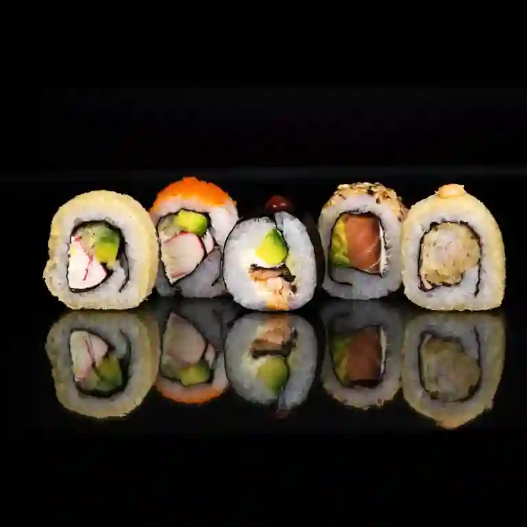 Elige 5 rollos (50 bocados) más 4 piezas de oreo tempura y 6 piezas de crunchykanis.