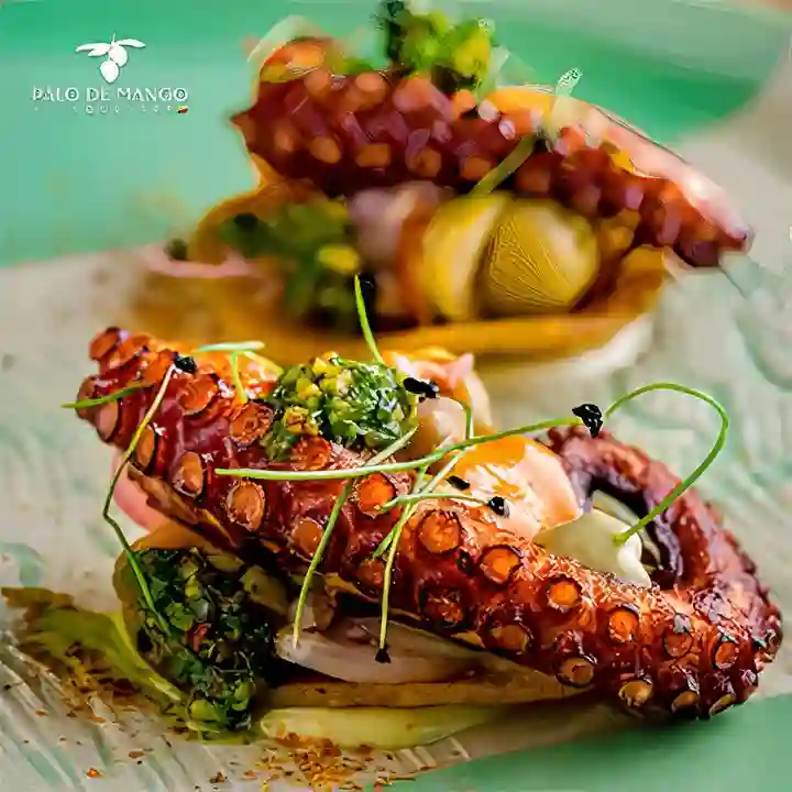 Pulpo servido con escabeche de cebollas y aceitunas, cremoso de aguacate y suero picoso sobre arepitas de maíz tostado.