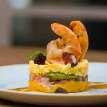 Causa de salmón con mayo de sriracha, aguacate y criollita chalaca.