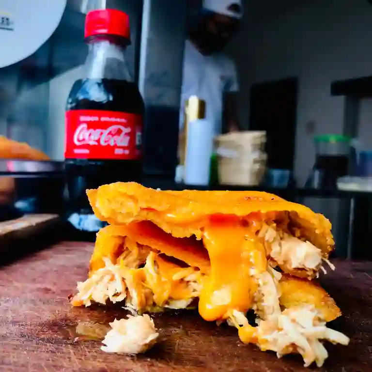 Empanada rellena de pechuga de pollo desmechada en salsa.