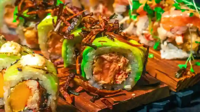 Roll relleno de camarones y palmitos crocantes, cubierto con masago y bañado en salsa fuji.