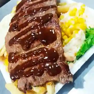 Pan. 140 gr de churrasco, queso, ensalada ripio de papa, salsas