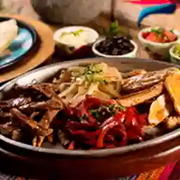 Fajitas con carne asada, pollo pastor, pimentón, cebolla, pico de gallo, guacamole, frijolitos y sour cream.
