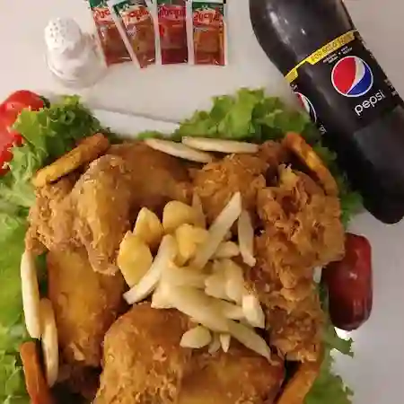 8 presas de pollo a la broaster acompañadas de 4 patacones, 4 arepas y una gaseosa litro a disponibilidad.