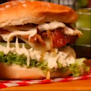 Hamburguesa con queso, tocineta, pollo, pan artesanal, ripio de papa, tomate verde, lechuga, ensalada de repollo picado, lechuga y mayonesa.