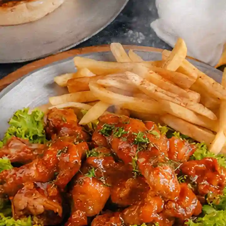 Papas a la francesa 200 gr, pollo apanado, mollejas, maíz, tocineta, chorizo, papas fosforito, queso costeño y salsa blanca boom.