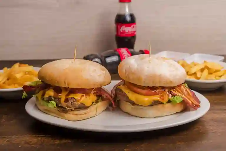 2 hamburguesas bane sencilla , papas a la francesa y 2 gaseosas coca-cola sabor original 250 ml.