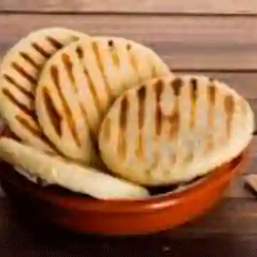 Dos arepas asadas, pollo, ahogado de cebolla, tomate, queso costeño y queso doble crema.