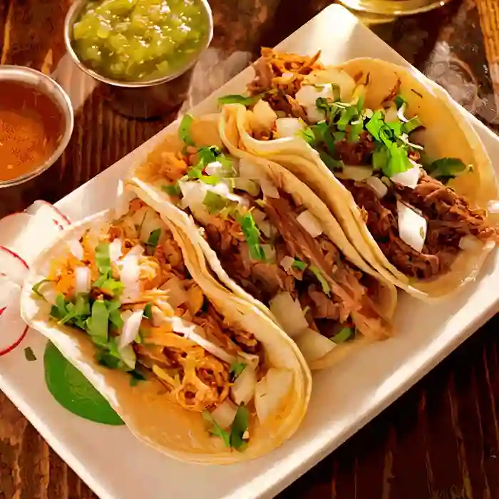 4 Tortillas de maíz con trozos de carne al pastor, cebolla, pimentón salteado y queso mozzarella.
