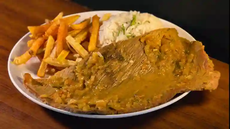 Sobrebarriga de res cocida lentamente en salsa criolla, acompañada de arroz y papas a la francesa.