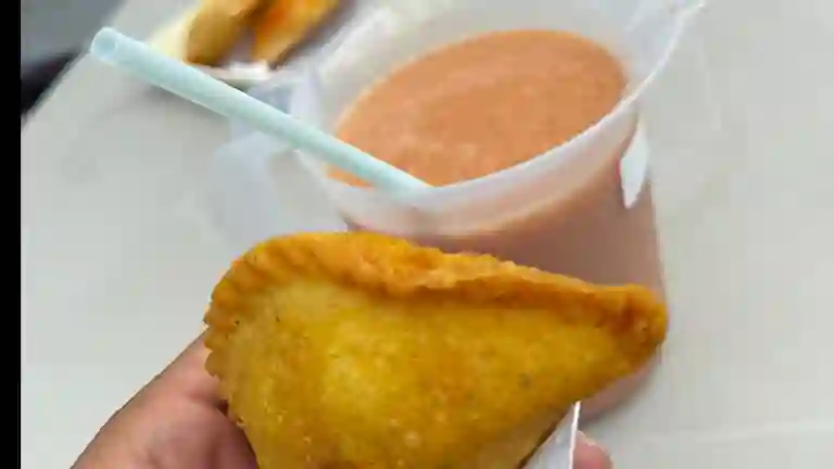 Empanada salada de masa de trigo rellena con pollo y queso, servida como pasabocas.