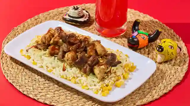 Base de lechuga, salsa de la casa, 200 gramos de papa, salchicha, 100 gramos de pollo, 100 gramos de carne, cebolla y pimenton a la grillé,queso costeño rayado, ripio de papa y salsa de la casa.