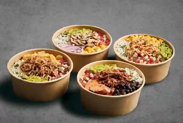 Arroz con cilantro, guacamole, pico de gallo (cebolla blanca, tomate y cilantro), maíz tierno, hogo y pechuga de pollo desmechada