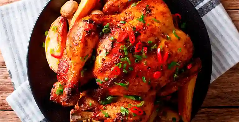 1 Pollo y medio con arroz, raíces chinas, arveja, zanahoria, jamón y papa francesa.