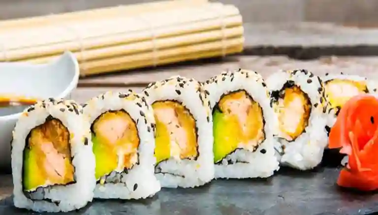 Salmón tempurado, aguacate, queso crema, ajonjolí mixto y salsa pasión.