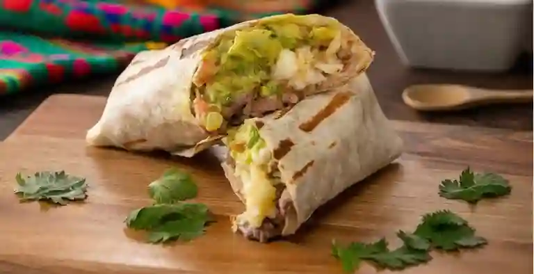 Tortilla rellena con carne de res, carne de cerdo, pollo, lechuga, frijol, queso fundido, guacamole y pico de gallo.