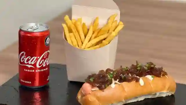 Pan dorado, salchicha americana, queso blanco derretido, dip de cebolla ahumada en vino y miel, salsa tártara más porción de papas y una bebida.
