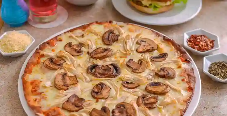 Pizza con queso mozzarella, pollo y champiñones, 8 pz.