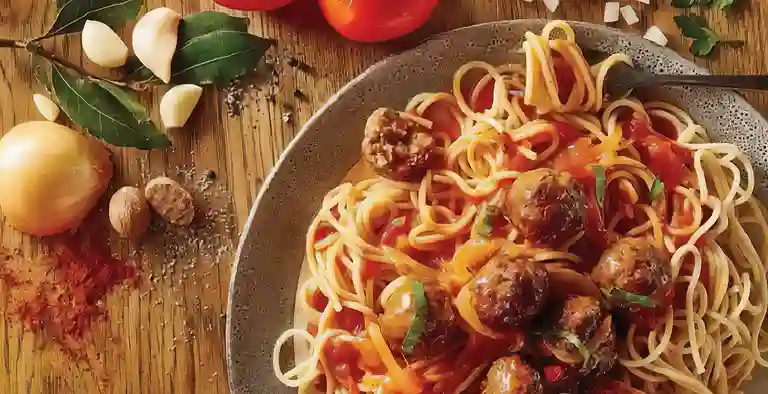 Pasta con tocineta ahumada y salsa napolitana, toque de picante.