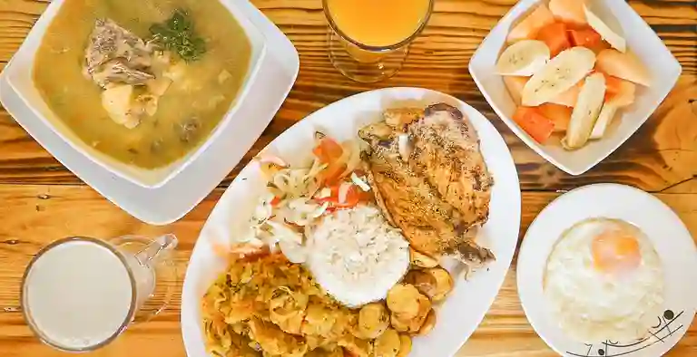 Pollo sudado 100 gr con arroz blanco, ensalada, acompañamiento de la casa, sopa del día, principios y bebida a elegir.