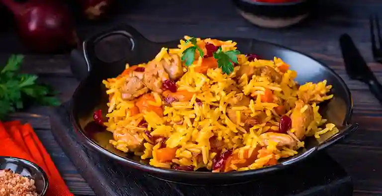 Camarón, pollo desmenuzado, jamón, cerdo y medio, pollo frito para 3 personas.