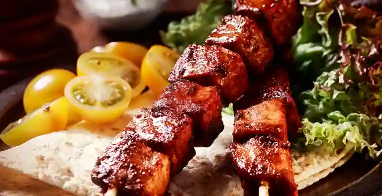 Chuzo mixto contramuslo de pollo, pierna de cerdo en el mismo pincho, receta exclusiva y delicioso sabor, artesanales acompañado: arepa con queso mozzarella, papas a la francesa y ensalada fresca.
