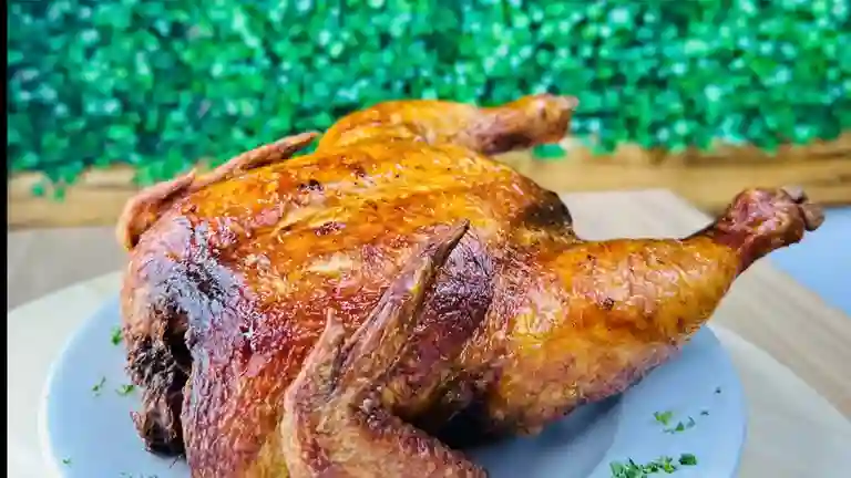 Pollo asado con 2 arepas fritas y ají de la casa.