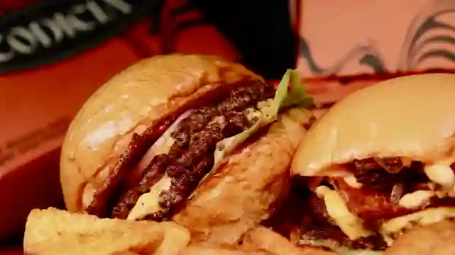 Hamburguesa con carne angus tipo smash 150 gr (doble carne), tocineta ahumada, doble queso cheddar y acompañada de papas en casco.