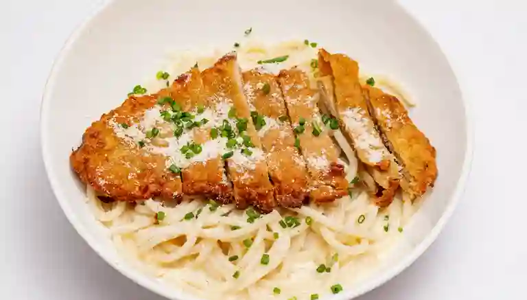 Espagueti en salsa Alfredo, Milanesa de pollo en tiras, Queso parmesano y Cebollín. Acompañada de pan.