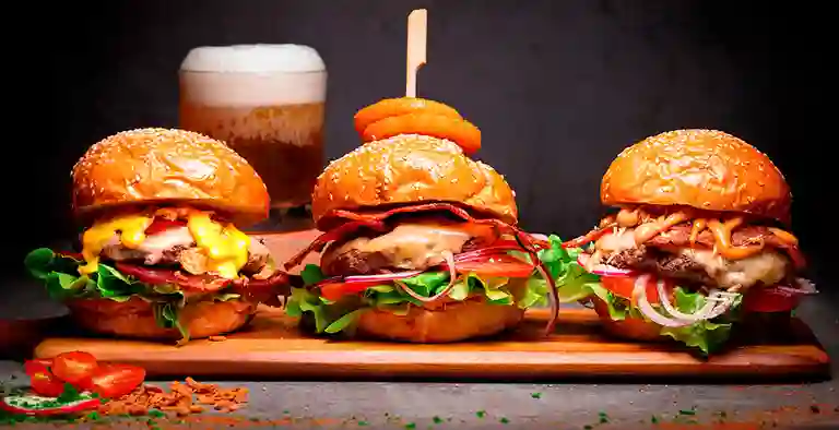Hamburguesa de pan brioche, carne artesanal 150 gr, filete de pollo al carbón 120 gr, costilla de res, queso gratinado, cebolla roja, lechuga, tomate, ripio y salsas de la casa.