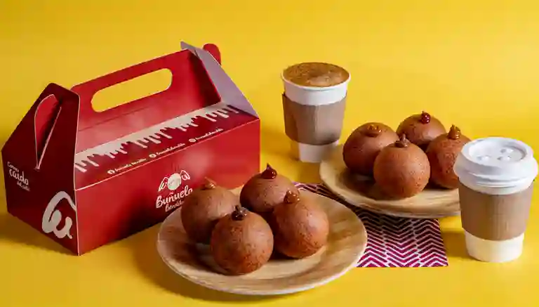 Caja con 4 buñuelos tradicionales de 60grs aproximadamente acompañada de un Americano.