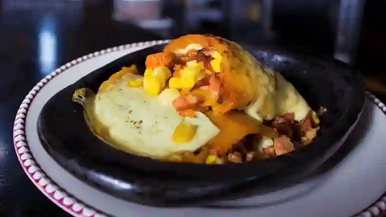 Crepe, maíz, tocineta, chorizo, queso, salsa de casa, pan francés
