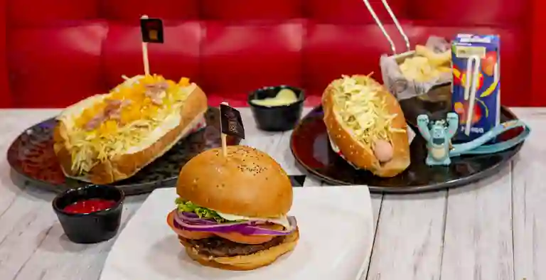 Carne de hamburguesa koller, queso, vegetales frescos, salsas de la casa y pan.