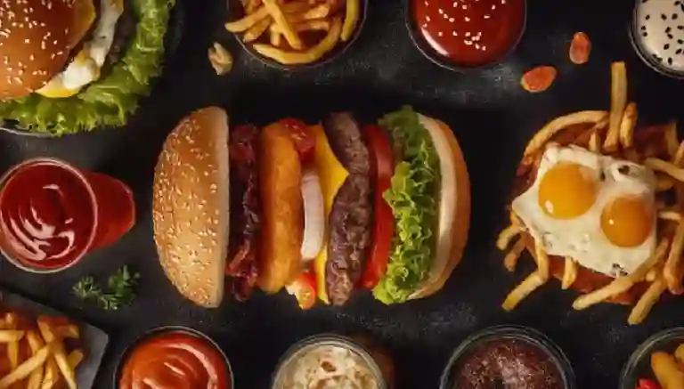 Hamburguesa con carne de res de 80 g, huevo, tocineta, queso cheddar, lechuga, tomate, cebolla, papas chips