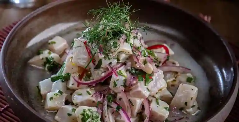 Este ceviche de pescado blanco resalta la frescura del pescado marinado en limón tahití con ajo y cebolla roja. se acompaña de mazorca dulce, pimentón y plátano frito, todo sazonado con sal de alta pureza y pimienta negra para un toque vibrante y tropical. acompañado con una bebida