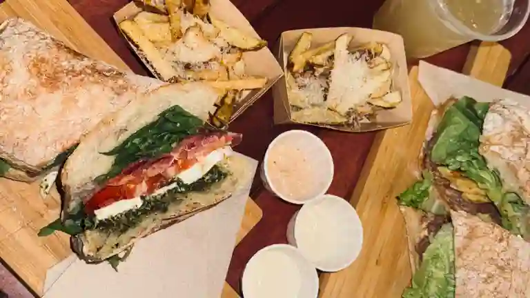 Pan artesanal ciabatta, carne de ternera, papas fritas dentro del sandwich, salsa andaluza (picante 4/10) y lechuga cogollo.