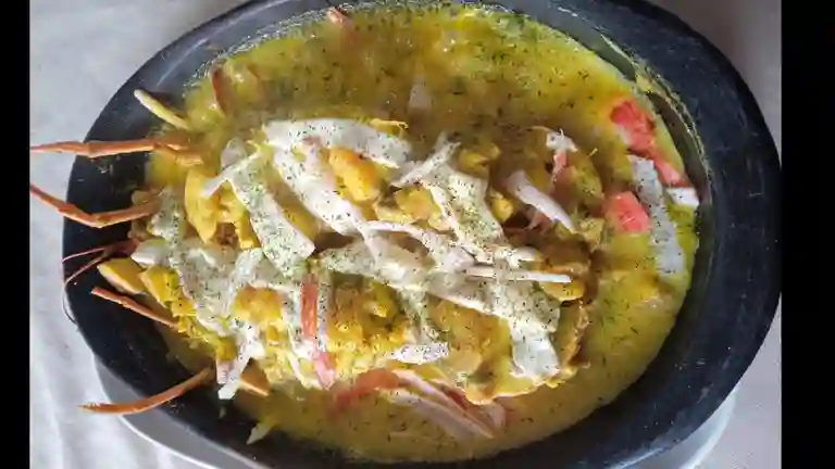 Cazuela con mariscos y vegetales, acompañada de arroz y patacón.