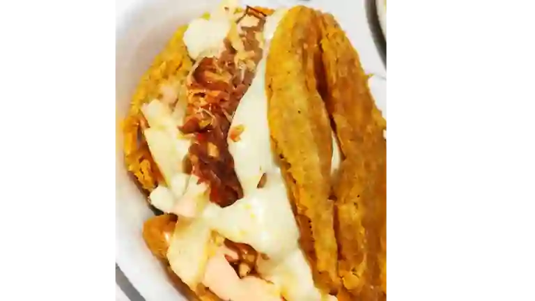 Doble patacón verde, carne y pollo en hogao , papas , queso , salsas