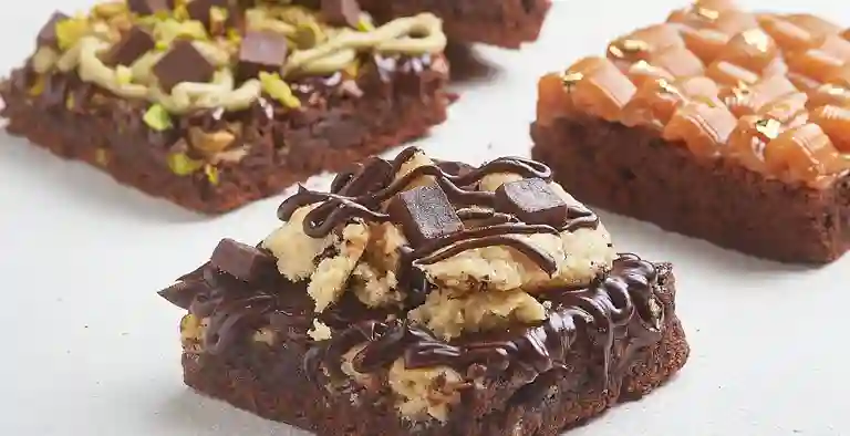 Brownie con una capa de galleta, decorado con crema de avellana, trozos de galletas y chunks de chocolate