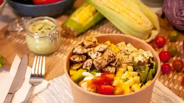 Pollo finas hierbas, mozzarella, tomate cherry, aguacate, huevo, zucchini, maíz y base de lechuga