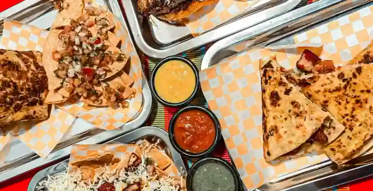 Totopos de maíz acompañados de frijol refrito, pico de gallo, guacamole, queso rallado, salsa de queso cheddar, birria y chicharrón.