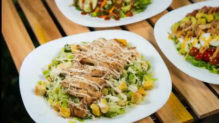 Ensalada romana original con lechuga romana, crotones, queso parmesano y pollo.